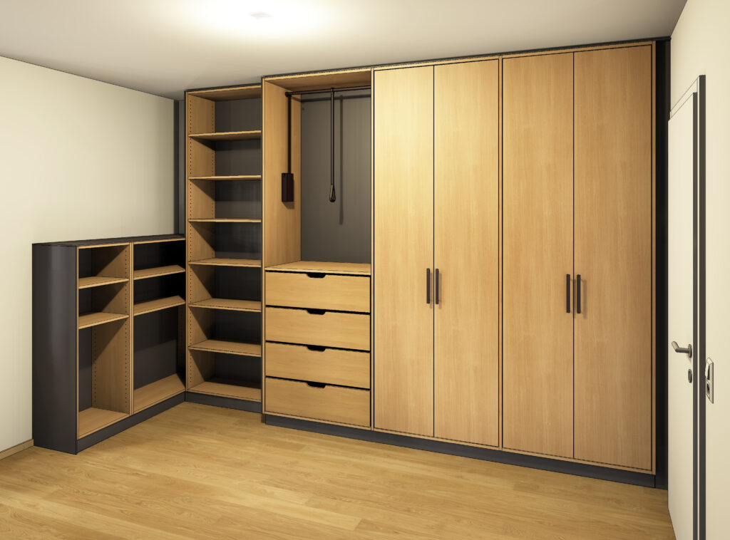 So entsteht ein maßgefertigter Kleiderschrank, der sich harmonisch in den Raum einfügt und gleichzeitig eine klare gestalterische Aussage trifft.